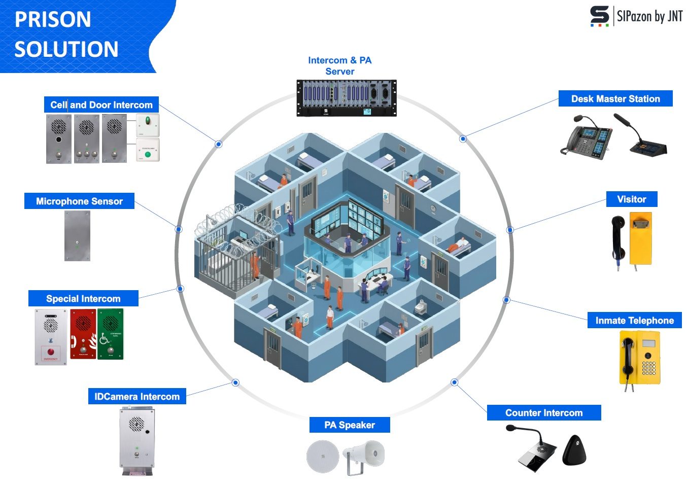 In de Benelux – en specifiek in Nederland – is communicatie binnen detentie-instellingen een kritische veiligheidscomponent. Nederlandse cellencomplexen maken traditioneel gebruik van celtelefonie, waardoor hoge beschikbaarheid, monitoring en integratie met overige beveiligingssystemen (PSIM/SMS, toegangscontrole, VMS) essentieel zijn. SIPazon levert hiervoor een volledig SIP-gebaseerd, open en robuust communicatieplatform, geschikt voor nieuwbouw én renovatieprojecten. Het systeem voldoet aan de hoogste veiligheidsstandaarden, is 24/7 operationeel en combineert vandaalbestendige intercoms, celtelefonie, PA-omroep, audio monitoring, high-availability servers en integratie met externe systemen op één centraal platform.